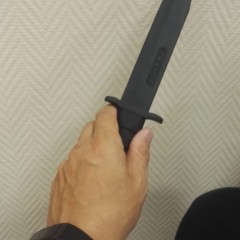 Хороший нож. Приятно сидит в руке, материал не резина - изготовлен из сантопрена . Полимер в меру жесткий и в меру эластичный. Не знаю что о нем еще написать, был бы стальной написал бы больше, а так для тренировок самое то. Если им пропустить тычковый удар то это будет чувствительно как ткнуть палкой, удар не пропустите. В целом обух и лезвие широкие можно на них нанести мел для понимания где пропущен порез. Короче рабочий тренировочный инструмент.